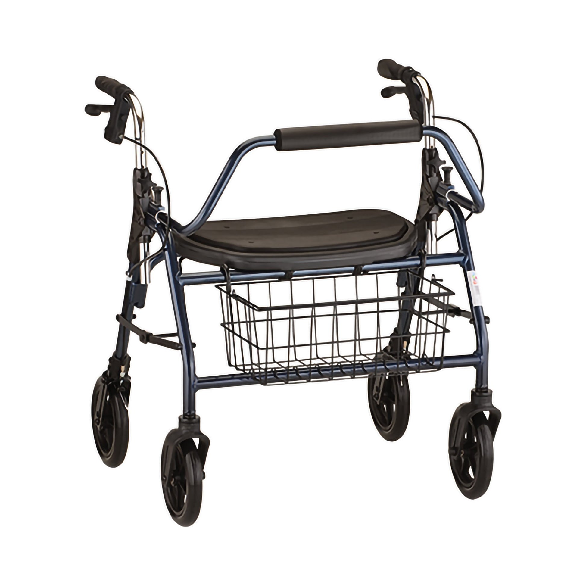 • 8-inch wheels, an extra wide seat with a built-in seat pad, locking hand brakes, a front wire basket, and a removable back